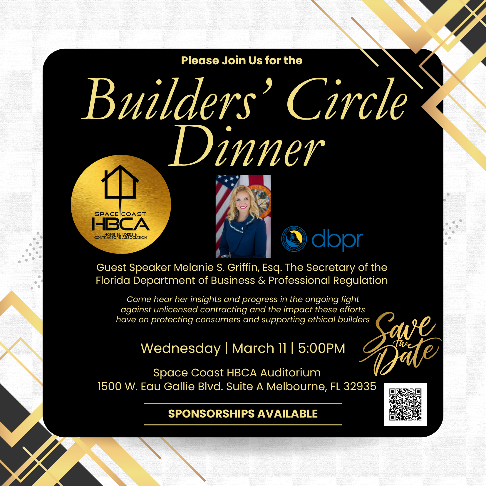 Builders Circle Dinner—a special joint event hosted by the HBCA’s General Contractors Council and the Home Builders Council. We are honored to welcome Melanie S. Griffin, Esq., Secretary, Florida Department of Business and Professional Regulation (DBPR) Secretary Griffin has been a leading voice in Florida’s efforts to protect homeowners, businesses, and the construction industry from the risks posed by unlicensed contractors. Under her leadership, DBPR has launched decisive enforcement operations targeting unlicensed activity and partnered with local and statewide agencies to hold bad actors accountable and educate the public on the importance of hiring licensed professionals. Unlicensed building contractors cause real and measurable harm to our industry, homeowners, and communities. They undercut legitimate professionals by avoiding licensing fees, insurance, taxes, and compliance requirements—leading to unfair competition and significant safety and financial risks. At the Builders Circle Dinner, Secretary Griffin will share her insights and progress in the ongoing fight against unlicensed contracting and the impact these efforts have on protecting consumers and supporting ethical builders.